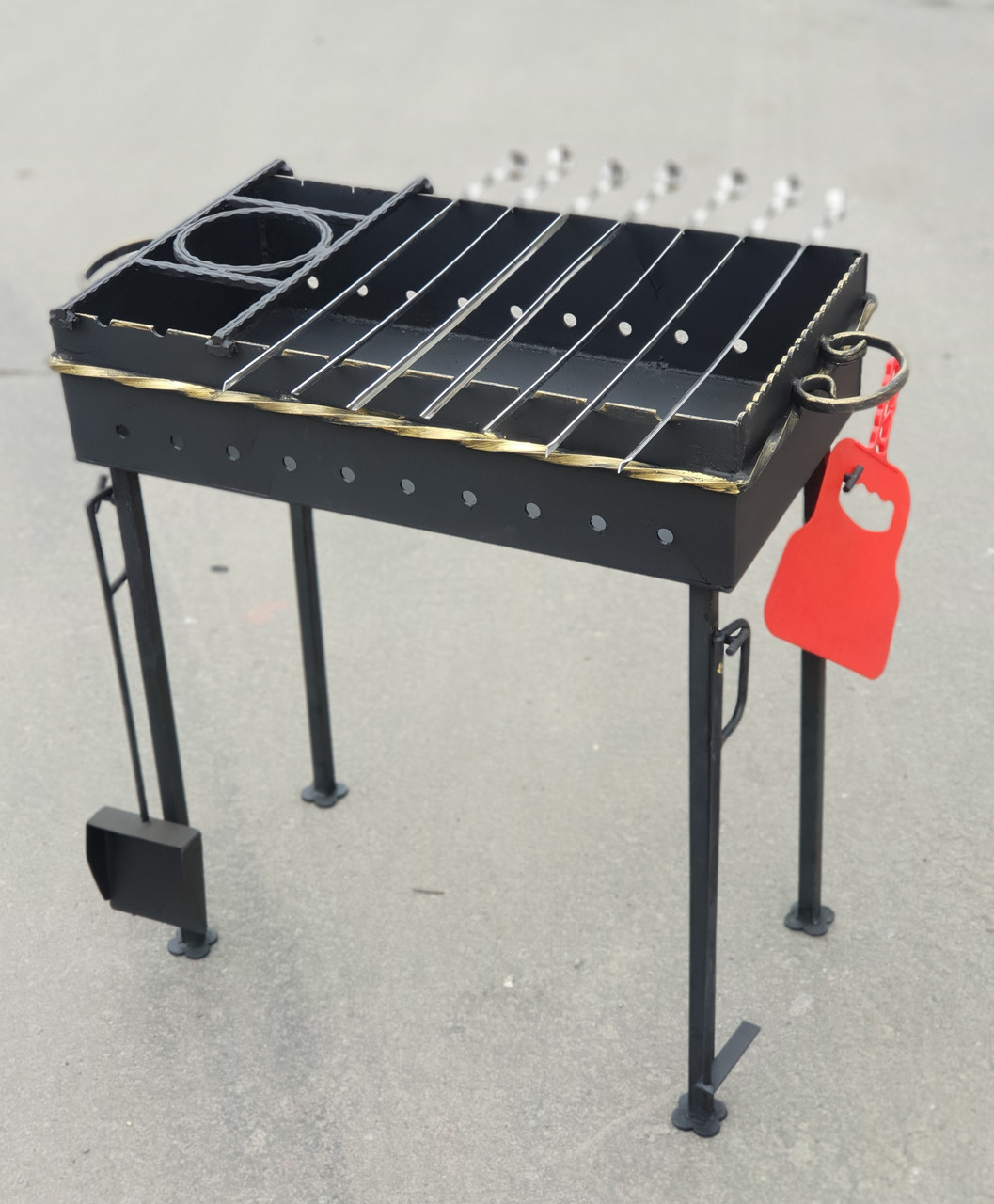 - ніжки мангалу виконані зі стальної профільованої труби 20х20 мм з підп’ятниками, для зручності транспортування вкладаються в середину жаровні;